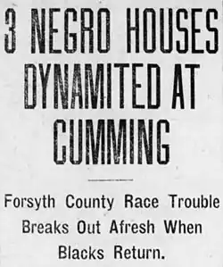 18. ^ "Terror in Cumming; Race Riot Feared". The Atlanta Georgian. September 11, 1912. p. 1. Retrieved March 5, 2023 – via newspapers.com.
