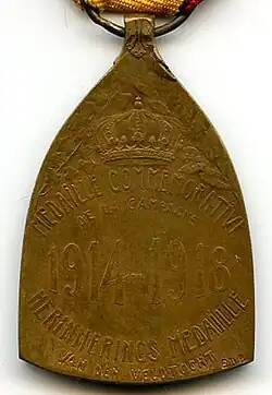 The Commemorative Medal of the 1914–1918 War (French: Médaille Commémorative de la Guerre 1914–1918, Dutch: Oorlogsherinnerinsmedaille 1914–1918) was a Belgian commemorative war medal established by royal decree on 21 July 1919 and awarded to all members of the Belgian Armed Forces who served during the First World War that were eligible for the inter-allied victory medal.[1]