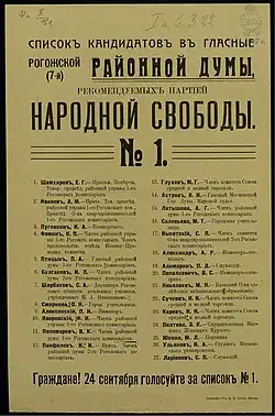 Elections to Moscow District Dumas were held on October 7 [O.S. September 24] 1917. It was the second of the three general elections in Moscow in 1917, between the City Duma election of June 1917 and the All-Russian Constituent Assembly election in November.[1] The Bolshevik Party won a landslide victory, obtaining an absolute majority in 11 out of 17 districts and a plurality in another 3 districts. The Kadet Party finished in second place, able to retain most of their support base from the June 1917 Moscow City Duma election whilst the support for the moderate socialists who had won the June 1917 election collapsed. The electoral participation was low.