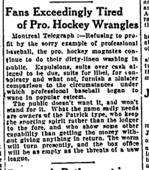 12. ^ a b "Claims Quinn Wants to Get Into the NHA". The Toronto Daily Star. December 17, 1918. p. 22.