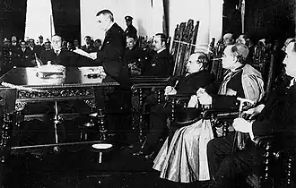Leguía called a plebiscite to submit to the vote of the citizens a series of constitutional reforms that he considered necessary; Among these reforms, it was contemplated to elect at the same time the President of the Republic and the members of Congress, both with five-year terms (previously, the presidential term was four years and Parliament was renewed by thirds every two years).[9] In this way, he wanted to strengthen the Executive against the Legislative and avoid the exacerbated parliamentary opposition that he had suffered in his first government. He also called for elections to be held in September to form a new constituent congress, which would take the name of the National Assembly, whose mission would be to give a new Political Constitution, replacing that of 1860, which was the one in force at that time.[19] The Assembly was installed on September 24, 1919, and was chaired by the sociologist and jurist Mariano H. Cornejo.[20] On October 12, the Assembly proclaimed Leguía as Constitutional President of the Republic.[1][21]