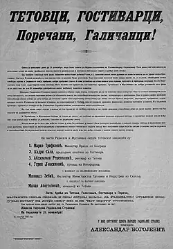 The Temporary National Representation adopted the Election Act on 2 September 1920.[9] The election law prescribed the universal suffrage for men over the age of 21 who were enrolled in the voter register. The law restricted the voting right to nationals of Serbia or Montenegro before 1 December 1918, citizens of Croatia-Slavonia or Dalmatia, and residents of Bosnia and Herzegovina and other territories included in Yugoslavia. The law also gave the right to vote to other Slavs residing in Yugoslavia, effectively numerous refugees from Russia,[10] but also confirmed the right of Slavic and Albanian minorities to vote.[11]