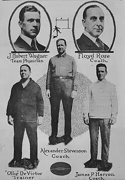 On September 6 the 1921 Pitt football prospects gathered at Camp Hamilton for their 2+1⁄2-week preseason training period. Since only four lettermen were lost from the 1920 squad – John McCrory, James Bond, William Edgar, and Herbert McCracken - and with the strong contingent from the 1920 freshmen team moving up, Coach Warner was expected to place another strong team on the field. Walter Ritchie, 1904 Pitt quarterback, and Lone Star Dietz, the famous Carlisle Indian (1909-1912), assisted Coach Warner the opening week of camp. Ritchie was assistant coach at Illinois Wesleyan and Dietz was the Purdue head coach. Ollie DeVictor was the newly appointed trainer and H. L. Westerman, senior med-student, was in charge of first aid. New facilities installed at the camp included a nine-hole golf course and tennis courts for the players enjoyment. The Panther squad broke camp on September 23 and returned to Pittsburgh. The next day they opened the 1921 season at Beaver Falls against the Covenantors of Geneva College.[18]