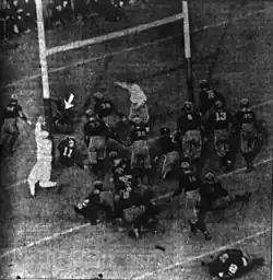 The Tigers had scored a single touchdown in the second quarter, and also the extra point for a total of seven; they then scored two additional touchdowns for 14 points in the final quarter to win the game, while holding Chicago scoreless.[9] With 12 minutes to play and Chicago nursing an 18–7 lead, Howdy Gray of Princeton picked up a Jimmy Pyott fumble and ran it 40 yards for the touchdown. Gray's father, the president of the Union Pacific Railroad, reacted by waving his program in the air, striking a woman in the shoulder.[6][10] After an additional Princeton touchdown was scored, Chicago responded with a fierce drive ending in a goal line stand with Thomas falling short of the goal.[1][11][12][13] Halfback Harry "Maud" Crum scored Princeton's other touchdowns.[14]
