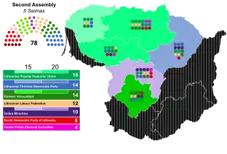 The elections were exceptionally successful for parties and lists representing ethnic minorities (Jews, Poles, Germans and Russians), receiving 18% of the vote and winning 14 seats, the highest total achieved in free and fair elections in Lithuania.[3]