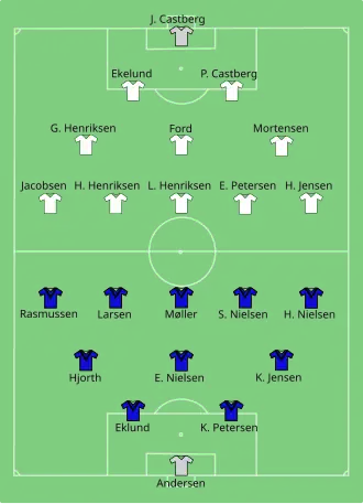 The first play-off match was played on 28 June 1927 19:15 CET at the exhibition field on Sundby Idrætspark (also referred to as Banen ved Englandsvej, Amager Sportspark or Amagers Idrætsanlæg) — originally the match was scheduled for 23 June 19:00 CET, but moved by the request of both clubs.[7][82][83] BK Standard's team line-up for the match consisted of Jens Castberg (goalkeeper), Peter Kastberg, Svend Ekelund, Knud Mortensen, Sidney Ford (born in England), Gahms Henriksen, Poul Jacobsen, H. Chr. Henriksen, Lund Henriksen, Edwin Petersen and Henry Jensen, while Christianhavns BK's team line-up consisted of Harly Andersen (goalkeeper), Einar Eklund, Kaj Petersen, Andreas Hjorth, Einer Nielsen, Karl Jensen, Henry Nielsen, Salomon Nielsen, Otto Møller, Axel Larsen, Chr. Rasmussen.[41][40][84][52] Christianshavns BK lost the first play-off match 3–1, which was attended by 2,000 spectators and which had the players switch sides directly after the conclusion of the first half without a 15 minutes break.[8][84] Following a missed penalty kick opportunity by Edwin Petersen of BK Standard, the match score remained 1–1 until only 5 minutes before full-time, when BK Standard managed to score twice with goals made by Lund Henriksen and Henry Jensen.[8][84] Hence Christianshavns BK did not manage to obtain a promotion to the 1927–28 KBUs A-række, while BK Standard secured their spot in the next season of KBUs A-række.[79][80]