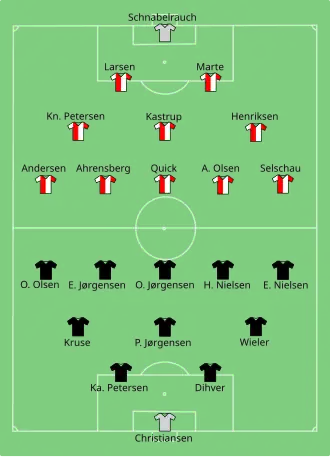 The 6th-placed team of the 1926–27 KBUs Mesterskabsrække met the winners of the 1926–27 KBUs A-række for a spot in the next season of the KBUs Mesterskabsrække as the league's extraordinary participant. The rules, that had been implemented from the beginning of the 1923–24 season, were designed so that winners of the KBUs A-række had to obtain at least three points (two points for a win, 1 point for a tie and 0 points for a loss) over the course of two play-off matches in order for the team to gain promotion.[25][19] The match was played on 16 June 1927 on the main football field of Københavns Idrætspark in clear and calm weather.[18][26] Handelsstandens Boldklub fielded the following players in their line-up using a 2–3–5 formation: goalkeeper and captain Karl Christiansen, defenders Kai Petersen and Kaj Dihver, midfielders Viggo Kruse, Poul Jørgensen and Frederik Wieder, forwards Ole Olsen, Ejner Jørgensen, Otto Jørgensen, Henning Nielsen and Ejner Nielsen, while BK Fremad Amager published the following line-up before the match in the same 2–3–5 formation: goalkeeper Henry Schnabelrauch, defenders Frode Marte and Otto Larsen, midfielders Valdemar Henriksen, Knud Kastrup and Knud Petersen, forwards Henrik Selchau, Alf Olsen, Ernst Quick, Harald Ahrensberg and Bernhard Vilhelm Andersen (nicknamed "Bette").[27][28] The starting line-up for the Amager-based team included four former national team players with two players actually having represented the club on a national level, with Knud Kastrup being the most recent player having played a national match 18 days earlier on 29 May 1927 away against Norway — leaving the average age of the squad much higher than that of the opponent.[29][30] The first half was dominated by BK Fremad Amager, who scored four goals and Handelsstandens BK only one, while the second half was played more evenly.[29][31] BK Fremad Amager won the first play-off match with the score 5–3 with all the team's five goals made by Ernst Quick and both clubs, therefore, remained in their respective tiers for the 1927/28–season — voiding the second play-off match.[10][29]