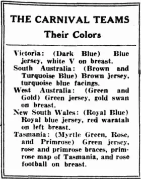 The weaker Victorian team — the centre of the controversy (on the grounds that only four of the team's players had appeared in either of Victoria's two earlier Carnival matches)[19] — made up of Frank Maher of Essendon (captain); Gordon Coventry of Collingwood; Garnet Campbell, Joe Harrison, and Greg Stockdale of Essendon; Gordon Hellwig, and Len Wigraft of Fitzroy; Charlie Gaudion, Alby Outen, and Roy Thompson of Footscray; Ted Pool of Hawthorn; Tommy McConville of Melbourne; Leo Dwyer, and Bill Russ of North Melbourne; Percy Bentley, and Tom O'Halloran of Richmond; and Martin Brown, and Austin Robertson of South Melbourne, played against New South Wales on Friday, 19 August, the day before the State's final match against West Australia.[20]