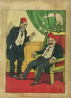 Egyptian Political Cartoon 1928 in Al Kachkoul, Issue 373, showing Mustafa al-Nahhas filling in Sa'ad Zaghloul's chair after his death.