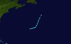 On August 23, another tropical storm was observed north of Puerto Rico. It moved northwestward for three days, slowly strengthening as it moved over the open ocean. The storm turned to the northeast and reached peak sustained winds of 50 mph (80 km/h) a short distance to the west of Bermuda. It began weakening shortly thereafter, and on August 30 the storm became extratropical to the southeast of Newfoundland. It continued to the northeast and was last observed on August 31 over the north-central Atlantic Ocean. It did not cause significant effects on land.[10][17]
