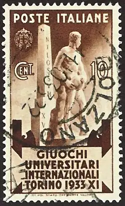 Stamp commemorating the 1933 International University Games, with statue of Benito Mussolini and obelisk.