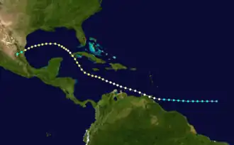 About two hours after striking Venezuela, the hurricane entered the southeastern Caribbean Sea. For the next few days it maintained its intensity while tracking to the northwest. A ship on June 30 reported a pressure of 982 mb (29.0 inHg), suggesting winds of about 100 mph (160 km/h). The next day, the hurricane passed south of Jamaica and turned more to the west before resuming a northwest motion. At around 06:00 UTC on July 3, the hurricane made landfall on western Cuba with winds of 100 mph (160 km/h). It weakened while crossing the island, although it maintained hurricane status upon entering the Gulf of Mexico.[1] On July 4, a strong high pressure area over the eastern United States turned the hurricane to the west.[2] After restrengthening, the storm attained peak winds of 110 mph (180 km/h) on July 5, based on a ship report of a pressure of 965 mbar (28.5 inHg). It maintained that intensity for about 18 hours, and during that time the hurricane turned to the southwest. At 01:00 UTC on July 8, the hurricane made its final landfall near La Pesca,[1] about halfway between Tampico, Tamaulipas and Brownsville, Texas.[2] The intensity at landfall was estimated at 85 mph (137 km/h). After moving ashore, the hurricane rapidly weakened over the high terrain of northeastern Mexico, and the storm dissipated at around 12:00 UTC on July 8.[1]
