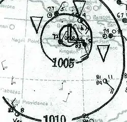 The hurricane originated over the southwestern Caribbean Sea, where, on October 17, a broad and immature low pressure system was noted. The hurricane forecast center in Jacksonville, Florida issued its first advisory on the storm late on October 20, following ship reports of winds approaching and exceeding gale-force.[1] Contemporary reanalyses of the storm have determined that it organized into a tropical depression on October 18, then drifted toward the east, turning north-northeastward as it strengthened into a tropical storm early the next day.[2] Due to low environmental air pressures and the large size of the cyclone, intensification was gradual as the storm approached Jamaica, eventually making landfall on the eastern side of the island, just west of the Morant Point Lighthouse, at 13:00 UTC on October 21. The system came ashore with a central pressure of 995 hPa (29.4 inHg), suggesting maximum winds of 60 mph (100 km/h).[3] After emerging into the waters between Jamaica and Cuba, the storm slowed in forward speed, continued to intensify, and curved northwestward toward southeastern Cuba. The storm attained the equivalent of Category 1 hurricane status on the current-day Saffir–Simpson hurricane wind scale early on October 22, while meandering just off the coast of Cuba.[1][2]