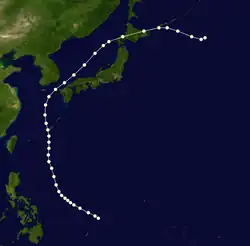 On September 22, a depression formed between Luzon and Guam. For the next four days, the system meandered without much development, eventually taking a northwest path on September 27 toward the Ryukyu Islands. On October 1, the typhoon slowed and made its closest approach to Okinawa, where a pressure of 982 mbar (29.005 inHg) was recorded in Okinawa. The typhoon turned northeastward and brushed the coast of southern Honshu, passing south of Tokyo on October 3. The system was last observed on October 5 near the Kuril Islands.[26] Across Japan, the typhoon killed 70 people, including 60 fatalities related to the sinking of the Kashima Maru. The typhoon also flooded about 4,000 houses.[27]
