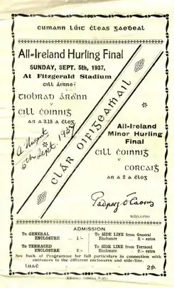 The 1937 All-Ireland Senior Hurling Championship Final was a hurling match played at Fitzgerald Stadium in Killarney, County Kerry on 5 September 1937 to determine the winners of the 1937 All-Ireland Senior Hurling Championship, the 51st season of the All-Ireland Senior Football Championship, a tournament organised by the Gaelic Athletic Association for the champions of the three hurling provinces of Ireland. The final was contested by Tipperary of Munster and Kilkenny of Leinster, with Tipperary winning by 3-11 to 0-3.