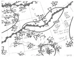 The final Atlantic hurricane of 1945 was not officially documented until over a decade following the end of the season. Using re-analyzed surface weather maps, as well as recounts from local residents along the storm's path, it was discovered that a tropical depression formed south of Jamaica in the southwestern Caribbean Sea by 12:00 UTC on October 10.[2][22] The compact storm moved north and then north-northeast ahead of a stationary front that existed from the western Atlantic into the Bay of Campeche. It became a minimal hurricane over the Cayman Islands by 00:00 UTC on October 12 and attained its peak at Category 2 intensity with winds of 100 mph (160 km/h) while making landfall along a deserted southern stretch of Cuba. The storm emerged into the Bahamas while maintaining Category 1 strength before becoming intertwined with the frontal zone and transitioning into an extratropical cyclone southwest of Bermuda.[22] The post-tropical storm slowly weakened but persisted until it was absorbed by a large extratropical low near the Azores on October 16.[2]