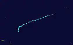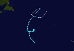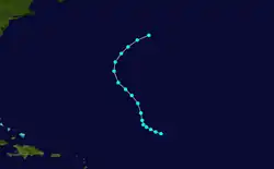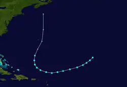 A tropical wave developed into a tropical storm east of Puerto Rico on September 3. It moved northward and strengthened to a hurricane later that day, but then weakened to a strong tropical storm the next day. At the same time, the system halted its forward motion and began to drift eastward. Early on September 5, it re-intensified into a hurricane, and it became a major hurricane on September 6. The storm turned to the north on September 7 and passed about 65 mi (105 km) east of Bermuda on September 8.[8][6] The hurricane weakened as it accelerated northeastward over cooler waters, and became extratropical on September 10 near Atlantic Canada. Shortly after becoming extratropical, it passed over Newfoundland, and ultimately dissipated on September 11 near southwestern Greenland.[8]