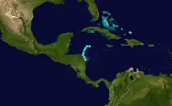 The final storm developed from a persistent low pressure area in the northwestern Caribbean Sea near Swan Island on November 3. A reconnaissance aircraft reported a well-defined eye feature as the storm reached its peak intensity. The storm drifted south-southwestward and began weakening on November 4. Later that day, it made landfall over northeastern Honduras as a tropical depression. Shortly after moving inland, the system dissipated.[8][6]