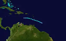 A tropical depression formed to the east of the Lesser Antilles on August 30. It moved steadily west-northwestward,[8] passing over Barbados as a weak tropical storm.[6] Seven people drowned on the island and 27 houses were destroyed in Bridgetown.[9] On Dominica, winds uprooted some trees, while rough seas damaged roads, jetties, and Landings.[15] After entering the Caribbean Sea on September 1, hostile conditions weakened the storm, and the third tropical cyclone of the season degenerated into a tropical wave on September 3 to the south of the eastern tip of the Dominican Republic.[8]