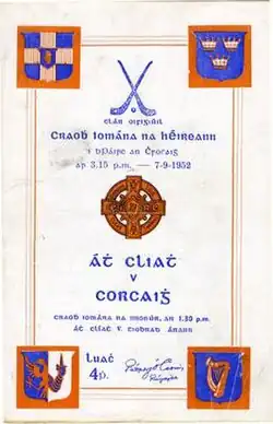 The 1952 All-Ireland Senior Hurling Championship Final was the 65th All-Ireland Final and the culmination of the 1952 All-Ireland Senior Hurling Championship, an inter-county hurling tournament for the top teams in Ireland. The match was held at Croke Park, Dublin, on 7 September 1952, between Cork and Dublin.[1] The Leinster champions lost to their Munster opponents on a score line of 2–14 to 0–7.
