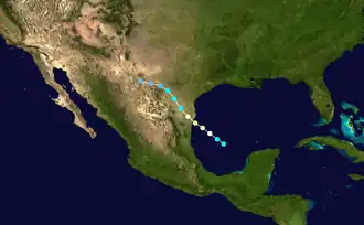 On October 2, a tropical depression moved westward from the coast of Cuba into the Gulf of Mexico. It moved westward without intensifying beyond winds of 35 mph (56 km/h), moving ashore about 40 mi (64 km) north of Brownsville, Texas. The depression weakened as it moved across southern Texas and dropped heavy rainfall. Brownsville recorded over 3 in (76 mm) in a 45-minute period, as well as about 6 in (150 mm) in six hours.[50] The rainfall rates of about an inch per hour was the heaviest since June 1950. The depression also moved ashore with high waves and tides.[51]