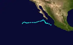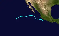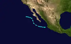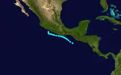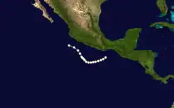 On June 17, an area of low pressure was identified on surface weather maps just off the coast of Guatemala.[5] The following day, the system was classified as a tropical storm approximately 210 mi (340 km) southwest of Guatemala City. Tracking generally northwest, the system acquired maximum sustained winds of 50 mph (85 km/h). On June 20–21, the storm moved parallel to the Mexican coastline before turning north on June 22. It was last noted offshore on this day, approximately 50 mi (85 km) south of Lázaro Cárdenas, Michoacán.[6]