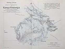 1914 map drawn by Jules Jacot-Guillarmod employing photographs from the 1899 Freshfield and 1905 Jacot-Guillarmod expeditions. The 1905 camps are marked, camp V being beside Pache's grave.