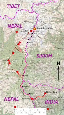 They left Darjeeling on 14 March for the 16-mile (26 km) journey to Mane Bhanjyang transporting their baggage in a convoy of dilapidated trucks.[note 7] This was the last large village on the road before their 10-day trek started on a track up to the crest of the Singalila Ridge from where, at 10,000 feet (3,000 m), there were three Indian government rest houses along the route north, the first being at Tonglu. At Phalut they turned west to enter the jungles of Nepal.[20] After Chyangthapu they headed north again through intensively cultivated terraced land. At Khebang (now Khewang) there was a long climb up to the pass leading to the Yalung valley where there was again jungle, which eventually turned into the gravel outwash of the Yalung glacier. After Tseram (now Cheram) were the remains of a monastery at Ramser and, near the terminal moraine of the 13-mile (21 km) Yalung glacier at 13,000 feet (4,000 m), the porters were paid off because the route up the glacier was too difficult for them. Yalung Camp was established as a substantial camp from where to acclimatise by climbing many nearby peaks.[21][2] [note 8] Accurate theodolite measurements were taken of features in the vicinity of Kangchenjunga's Yalung, or southwest, face. A supply chain for food for the Sherpas – tsampa and atta – was organised from Ghunsa village two days carry away. Also, plans were made for the future moving of goods from Yalung to a base camp much higher up the glacier.[21]