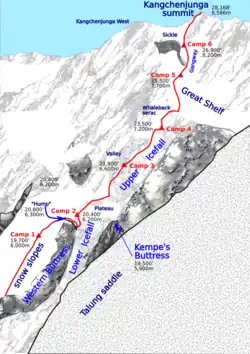 Camp 1 19,500[32] 5,900 19 April[33] Top of Kempe's buttress[note 12]