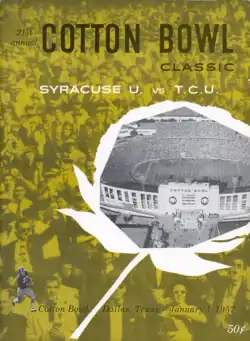 The 1957 Cotton Bowl Classic was the 21st edition of the college football bowl game, played at the Cotton Bowl in Dallas, on Tuesday, January 1. Part of the 1956–57 bowl game season, it matched the independent and eighth-ranked Syracuse Orangemen and No. 14 TCU Horned Frogs of the Southwest Conference (SWC).[2] Favored TCU held on to win by a point, 28–27.[3]