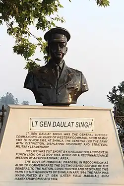 Apart from these, the Daulat Singh Park in Shimla, named for Lieutenant General Daulet Singh, has a bust of the general.[16] A statue of Lieutenant General Bikram Singh is installed in Jammu and a memorial in his ancestral village of Siana in Nawanshahr. A library and a museum dedicated to the general is also being constructed. The Bikram Chowk in Jammu is also named for the general. Two committees – the Lieutenant General Bikram Singh Society at Kahma village and the Lieutenant General Bikram Singh Yadgaar Committee in Jammu organise ceremonies, akhand paths, blood donation camps among other events to remember him.[17]