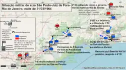 In a meeting with his generals around midnight on 31 March, Amaury Kruel sided his 2nd Army with the coup and ordered the invasion of Rio de Janeiro.[1] At this time, the Tiradentes Detachment, a unit sent on campaign by general Olímpio Mourão Filho, had already crossed the border between Minas Gerais and Rio de Janeiro and come into contact with the loyalist forces sent from Guanabara and Petrópolis to confront it. By noon on 1 April, the detachment had advanced to the Areal region, facing the 2nd Infantry Regiment (2º Regimento de Infantaria; 2º RI). Meanwhile, the School-Unit Group (GUEs) would form the loyalist reaction to the 2nd Army.[2]