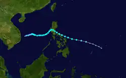 Severe damage took place across the Philippines, with Leyte suffering the brunt of Irma's impact.[4] Twenty people died across the country.[5] Preliminary reports indicated that Tacloban incurred $2.5 million in damage.[4] A gasoline explosion near Manila that killed 12 people and injured 18 others was partially attributed to the typhoon.[6] On May 17, the 740 ton vessel Pioneer Cebu sailed directly into the storm over the Visayan Sea off the coast of Malapascua Island after ignoring warnings to remain at port. Carrying 262 people, the ship struck a reef while battling rough seas in the typhoon.[4] Passengers began abandoning the sinking vessel soon thereafter under the captain's orders while message about the ship's sinking was relayed by the radio operator. A large wave then struck the ship on its side, capsizing and submerging it entirely. Of the passengers and crew, 122 went down with the ship, including captain Floro Yap, while 140 managed to escape.[7][8] Rescue operations lasted nearly two days, with many of the survivors being stranded in shark infested waters for upwards of 40 hours.[8] Of the survivors, 130 were picked up by a rescue ship while 10 others were found on nearby islands.[7] Only five bodies were recovered in the area while the rest were presumed to be lost with the ship in an area referred to as the "graveyard of ships."[8] A trading vessel, the Banca Alex, also sank off the coast of Cebu with 80 people aboard; 60 were later rescued while 20 others were never found.[9]