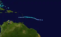A tropical disturbance moved westward from the African coast on September 20. On September 26, satellite imagery and ship observations indicated that a tropical depression about 830 mi (1,340 km) east of Barbados.[2][4] At 21:00 UTC, the NHC issued their first advisory, naming the system Edith.[10] A nearby ship reported 16 ft (4.9 m) waves on September 27, potentially indicating stronger winds during periods without meteorological observations,[11] although unfavorable conditions prevented initial development.[12] It was not until 12:00 UTC that Edith attained tropical storm force winds. Twelve hours later, the storm reached peak winds of 60 mph (97 km/h),[6] a trend that spurred hurricane watches from Dominica northward through the Leeward Islands.[13] The storm failed to intensify due to its proximity to a cold upper-level trough and releasing too much latent heat. On September 30, Edith passed over Dominica as a weakened tropical storm and dissipated the next day over the eastern Caribbean Sea. It caused gusty winds and minor damage during its passage through the Lesser Antilles.[4]