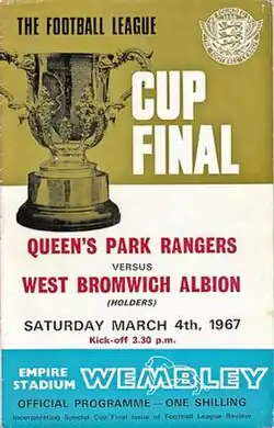 The 1967 Football League Cup Final was an association football match between Queens Park Rangers (QPR) and West Bromwich Albion on 4 March 1967 at Wembley Stadium, London. It was the final match of the 1966–67 Football League Cup, the seventh season of the Football League Cup, a football competition for the teams in The Football League. This was the first final to be decided over a single game; the six previous finals were contested over two legs. QPR were appearing in their first final, while Albion were appearing in their second after winning the previous final in 1966.