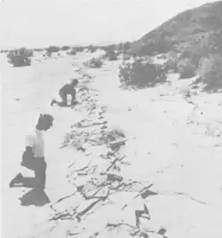 A 33 km (21 mi)-long surface rupture through Quaternary alluvium and lake bed sediments was revealed. At its northern extreme, the rupture sliced through the Palm Spring Formation. The rupture zone consisted of two northwest-oriented segments, separated by a 2 km (1.2 mi)-wide discontinuity.[13] Smaller, isolated ruptures were found 3 km (1.9 mi) away from the main trace.[14] A maximum horizontal offset of 38 cm (15 in) was measured along the northern rupture located 5 km (3.1 mi) northwest of Ocotillo Wells, at the foothills of Borrego Mountain.[15] Along the southern rupture, the maximum offset was 20 cm (7.9 in), measured 10 km (6.2 mi) southeast of Ocotillo Wells. Vertical offsets of up to 20 cm (7.9 in) were also recorded.[13]