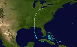 Ship reports on September 19 indicated the presence of low pressure area in the Gulf of Mexico, centered about 300 mi (480 km) west-northwest of Key West, Florida.[44] It is estimated that a tropical depression developed at 1200 UTC on that day. The depression headed north-northwestward and did not strengthen significantly, although it may have briefly become a tropical storm.[14][2] By early on September 21, the depression made landfall between Panama City and Port St. Joe, Florida.[44] It degenerated into a remnant low pressure area only a few hours later.[2] A high-pressure ridge blocked the system's movement, moving it to the east. By September 23, the system became a low pressure trough. Upper-level wind shear moved the circulation to the east-northeast and moved into the Atlantic Ocean the next day.[4]