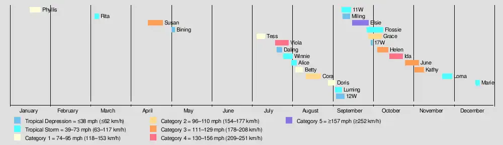 Typhoon Phyllis was a weak tropical cyclone that formed in January 16, 1969. It was the first storm of the 1969 Pacific typhoon season. It had winds of 155 km/h (100 mph), it later dissipated on January 24, 1969. Despite its minimal impact, it serves as a reminder of the early start to the typhoon season and the potential for tropical cyclones to develop even in off-peak months.