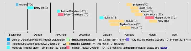 On January 19, Severe Tropical Cyclone Myrtle entered the South-West Indian Ocean; therefore, it was assigned a second name, Ginette. The next day, Ginette reached hurricane status and developed a clear eye as it traveled generally west-southwestward. On January 22, Ginette curved southwestward and came within 72 kilometers (45 miles) of the island of Rodrigues. On Rodrigues, winds as high as 150 km/h (93 mph) were recorded along with a minimum barometric pressure of 989 mbar (29.2 inHg). Throughout the next two days, Ginette approached the island of Reunion, causing stormy weather that lasted until January 29. In Reunion, swells associated with Ginette reached 6 meters (20 feet) at times. On January 25, Ginette became stationary while located south of Reunion. The next day, Ginette encountered a ridge which caused it to execute a small clockwise loop. After completing the loop, Ginette accelerated southeastward and gradually weakened. By January 31, Ginette had transitioned into an extratropical cyclone.[2]