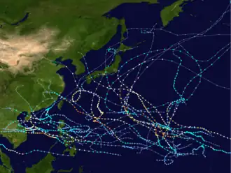 A total of 36 tropical depressions formed this year in the Western Pacific, of which 30 became tropical storms. Twenty-two storms reached typhoon intensity, of which two reached super typhoon strength.[1]