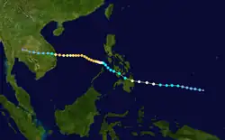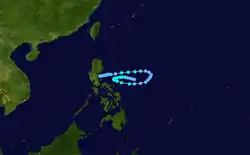A disturbance in the ITCZ became a tropical depression on July 5. It headed northwest over the Philippines. It intensified into a tropical storm almost immediately after entering the South China Sea on July 8. It then turned north, and erratically drifted and looped for four days. On July 11, Susan became a typhoon. On July 14, Susan moved close to the Taiwan Strait. It made landfall on the coast of Fujian province, and dissipated inland on July 15.[8]