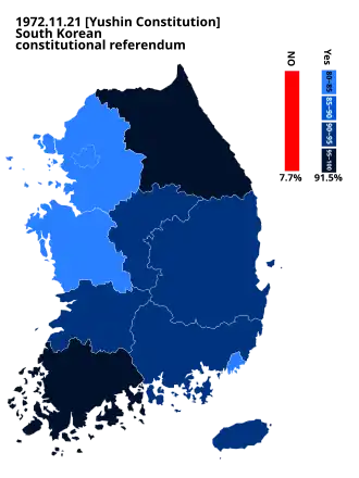 According to official figures, the new document was approved by 92.3% of voters, with a turnout of 91.9%.[2] The adoption of the constitution upon the announcement of the official referendum results ushered in the Fourth Republic of South Korea.