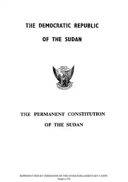 The 1973 Constitution of Sudan, known at the time as the Permanent Constitution of Sudan, was the first permanent constitution in Sudan introduced under the leadership of President Gaafar Nimeiry. The constitution explicitly identified Islamic law as a primary source of legislation, which was a pivotal shift from previous legal frameworks that had been more secular in nature.[1] The constitution was enacted in May 1973.[2]