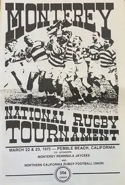 The 1975 Monterey National Rugby Championship was the 17th edition of the tournament and was considered to be the de facto national championship.[17][18][19][20][21][22][23][24] This event took place at Pebble Beach, CA from March 22–23. The tournament MVP was Mike Hodgins (Cal Berkeley), Most Valuable Fan was 86 year old Watson Luke, Steve Montgomery of the Old Blues won the Drop Kick competition while Mickey Ording of X–Os was runner-up.[25] UCLA went 5–0 to take first place.[26][27][28][29][30][31]