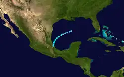 A tropical wave developed into a tropical depression near Trinidad on September 13. By the following day, the depression strengthened into Tropical Storm Greta. It headed westward to west-northwestward across the Caribbean Sea and slowly intensified, becoming a hurricane on September 16.[50] The rate of intensification increased as Greta was approaching the northwestern Caribbean Sea. Greta briefly peaked as a Category 4 hurricane with maximum sustained winds of 130 mph (210 km/h) and a minimum barometric pressure of 947 mbar (28.0 inHg), while brushing northeastern Honduras. Although the storm remained offshore, land interaction caused significant weakening. On September 19, Greta made landfall in Stann Creek District, Belize with winds of 110 mph (180 km/h).[51] The storm rapidly weakened inland over Central America, but survived its passage and eventually became Hurricane Olivia in the Eastern Pacific Ocean.[52]