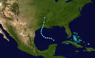 A low-pressure area that developed over southeast Florida and an area of convection near the Yucatán Peninsula merged and resulted in the formation of a tropical depression over the southern Gulf of Mexico on August 26. Tacking west-northwestward around a high-pressure ridge, the depression gradually intensified began and was upgraded to Tropical Storm Debra on August 28. Debra turned to the north and reached its peak intensity of 60 mph (97 km/h) on August 29, shortly before making landfall in southwestern Louisiana. It was a disorganized storm, with most of the convection located to the east of the center.[34] The system weakened rapidly and dissipated over Arkansas on August 29, though its remnants continued into the Ohio Valley.[34][35]