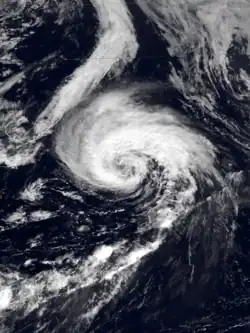 Six hours after being named, Irma reached its peak intensity of 50 mph (80 km/h).[64] On October 5, Irma turned towards the north-northeast and passed about midway between the central and western Azores.[62] Shortly thereafter, Irma became less organized,[65] and that evening was absorbed into an approaching cold front, about 450 mi (720 km) northeast of the Azores.[66] Although Irma passed near parts of the western and central Azores with gale-force winds in some areas, no reports of damage or casualties caused by Irma were received. Several nearby ships reported winds around 46 mph (74 km/h). It was noted that heavy rains may have occurred on some of the mountainous islands as Irma passed.[62]