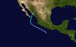 The season's second tropical cyclone began as a disturbance spawned by an African tropical wave southwest of the Mexico coastline on June 15.[4] It moved generally westward over very warm waters, and observations from satellite imagery and ships outlined the formation of a tropical depression by 00:00 UTC on June 17.[5] Six hours later, the depression intensified into Tropical Storm Bud.[6] Continued ship observations relayed Bud's intensification to a 60 mph (97 km/h) cyclone on June 18, but the storm weakened thereafter as it moved west-northwest under the influence of a ridge,[5] and it ultimately dissipated within the ITCZ after 06:00 UTC on June 26 while located over the open Central Pacific.[6][7]