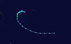 During the opening days of March 1980, a broad trough of low pressure, extended from Vanuatu to Queensland, Australia.[1] A tropical depression subsequently developed, along this trough during March 9, near Rennell Island in the Solomon Islands.[1][2] Over the next few days the system initially moved south-eastwards into the Australian region, as it gradually developed further before it turned south-westwards towards the South Pacific during March 10.[1] The Australian Bureau of Meteorology, subsequently reported that the depression, had developed into a tropical cyclone and named it Sina during March 11.[1] The system subsequently moved south-eastwards and back into the South Pacific basin, where it continued to intensify and move south-eastwards. During March 13, the system peaked as a Category 3 severe tropical cyclone with 10-minute sustained wind speeds estimated at 120 km/h (75 mph), as it passed about 200 km (125 mi) to the southwest of New Caledonia.[1][3] After the system had peaked, it accelerated south-eastwards while gradually weakened and transitioning into a cold cored low.[1][3] The system impacted northern New Zealand during March 15, before it was last noted during the following day.[1][3]