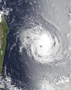 Toward the beginning of January, the ITCZ was active to the northeast of Madagascar, spawning a circulation east of Agalega that became a depression on January 3. On the next day, the system was named Florine. Steered between a ridge to its northwest and northeast, the system moved erratically until January 5, when Florine began a steady movement to the south and later southwest. The change in trajectory was because the ridge to Florine's northeast had weakened. On January 6, the intensifying storm passed just west of St. Brandon, where a station recorded sustained winds of 115 km/h (71 mph) and gusts of 148 km/h (92 mph). A day later, the outer eyewall of Florine moved across Réunion island, while the center of the eye passed 25 km east of Sainte-Rose. Roland Garros Airport recorded a minimum pressure of 935 mbar (27.6 inHg), the lowest on the island. A landfall was spared due to a shift in trajectory to the south-southeast caused by a passing cold front.[6] Also around this time, the cyclone reached its peak intensity according to the JTWC; the agency estimated peak winds of 195 km/h (121 mph), based on a Dvorak rating of 5.5.[7][8] The MFR estimated peak 10 minute winds of 220 km/h (140 mph).[6] Florine weakened as it accelerated ahead of a polar trough, and was no classifiable as a tropical cyclone on January 10. The remnants passed west of Île Amsterdam on the next day and continued southeastward.[6][7]